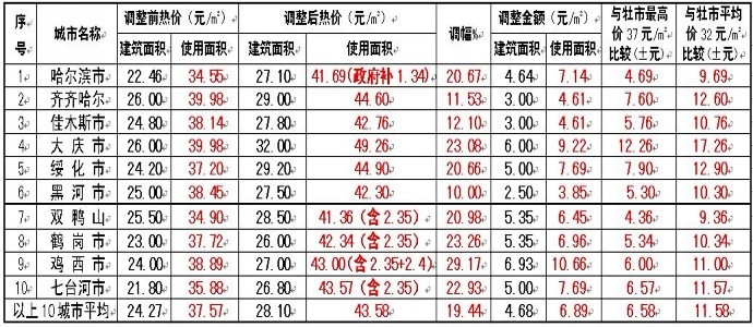 貫徹國家三部委和省政府關(guān)于啟動煤熱價格聯(lián)動機(jī)制要求,2008年哈爾濱、齊齊哈爾、佳木斯、大慶、雞西、雙鴨山、鶴崗、綏化等8城市都調(diào)整了熱價,2009年七臺河市、伊春市調(diào)整了熱價,2010年黑河市也調(diào)整了熱價,見下表: