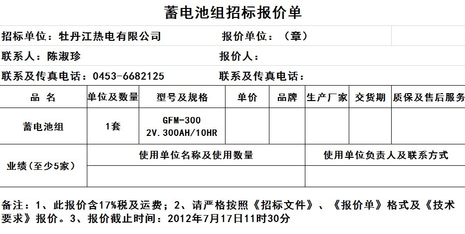 牡丹江熱電有限公司西城供熱公司,需購買蓄電池組GFM-300 2V.300AH/10HR一套,現(xiàn)進行公開招標,誠摯地歡迎有資質(zhì)的生產(chǎn)及經(jīng)營單位參與投標。